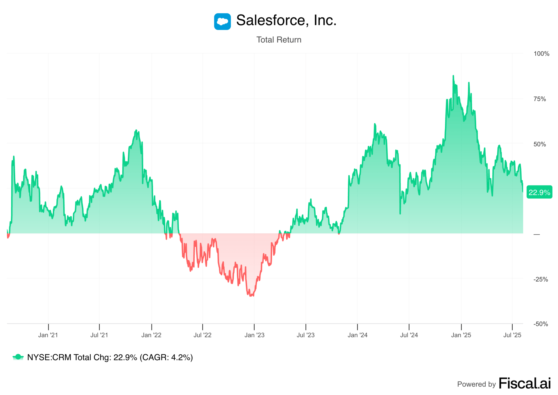 The stock is down over 30% from its December 2024 peak, with a five-year total return of just 23%.