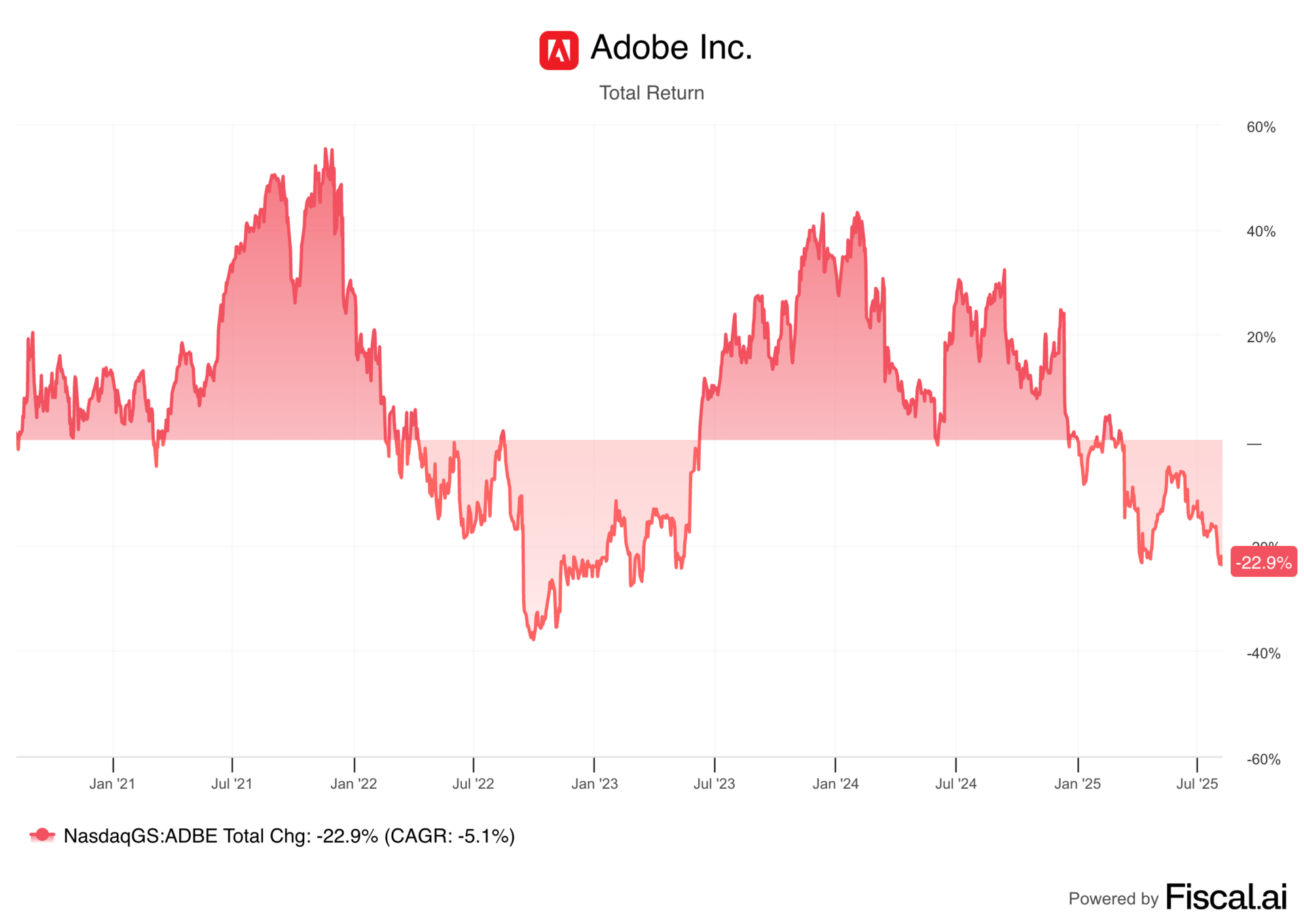 Over the past five years, Adobe has returned –23%, sharply underperforming the S&P 500, even as net income grew 86%, a gap largely driven by valuation multiple contraction rather than weak fundamentals.