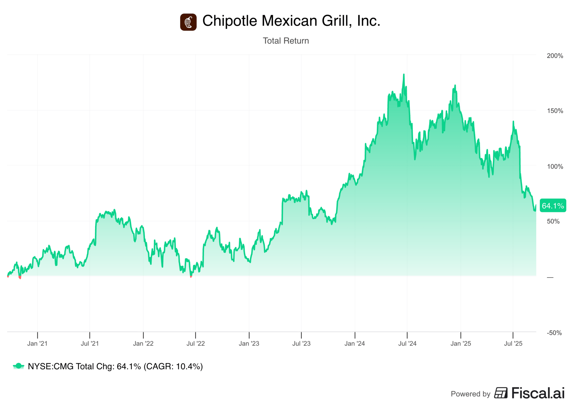 Over the past five years, Chipotle has delivered a 62% total return, while net income has increased 338% in the same period, reflecting valuation multiple contraction.