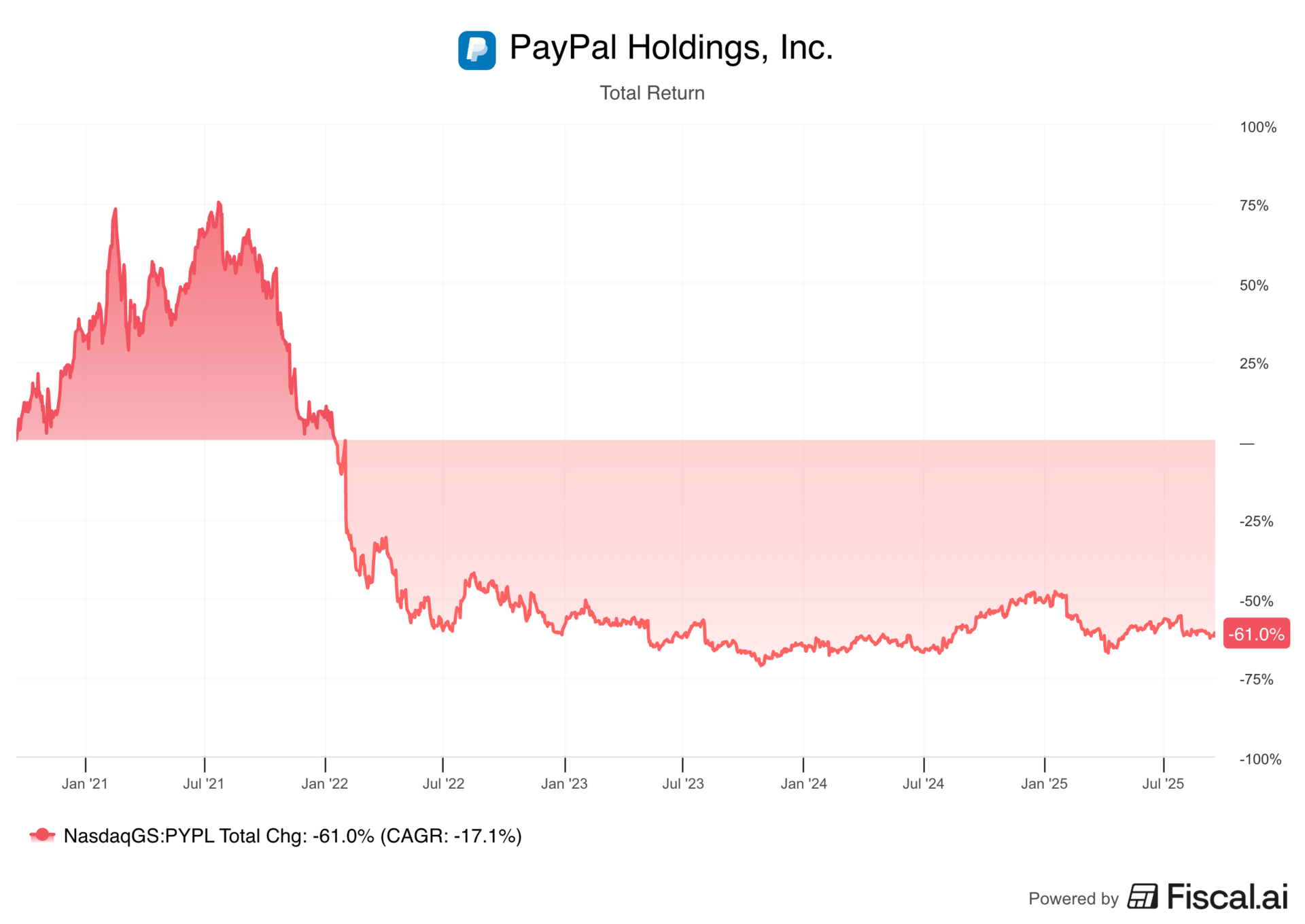 The company has built one of the largest digital wallets in the world, but over the past five years its stock has delivered a total return of -61%, massively underperforming the S&P 500’s 114% return.