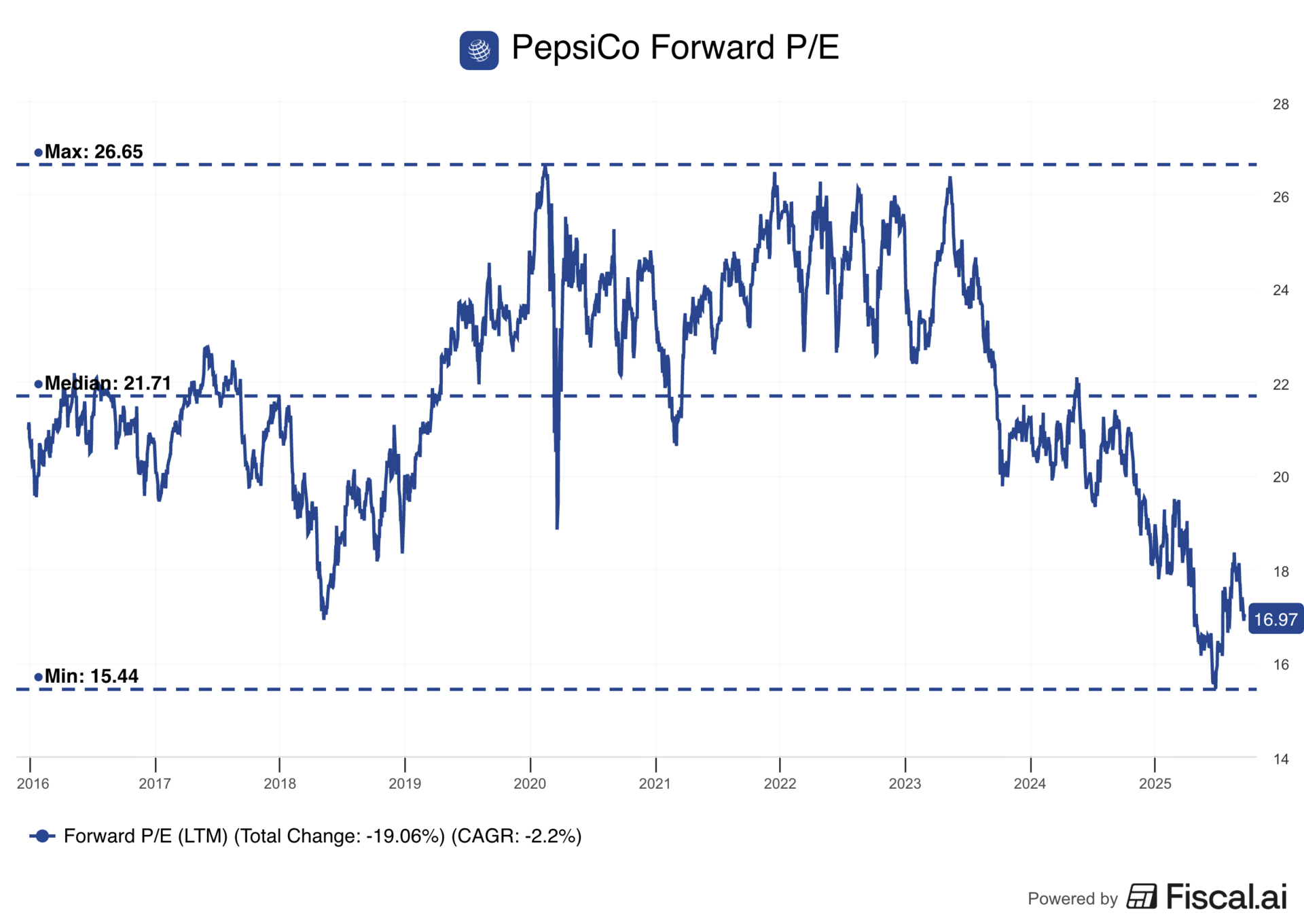 3/ Attractive Valuation & Dividend Yield — Trading at ~17x forward earnings versus the S&P 500’s ~24x, PepsiCo offers value for a global brand of its scale. On top of that, investors collect a 3.9% dividend yield, backed by a 10-year dividend CAGR of 7.5%.