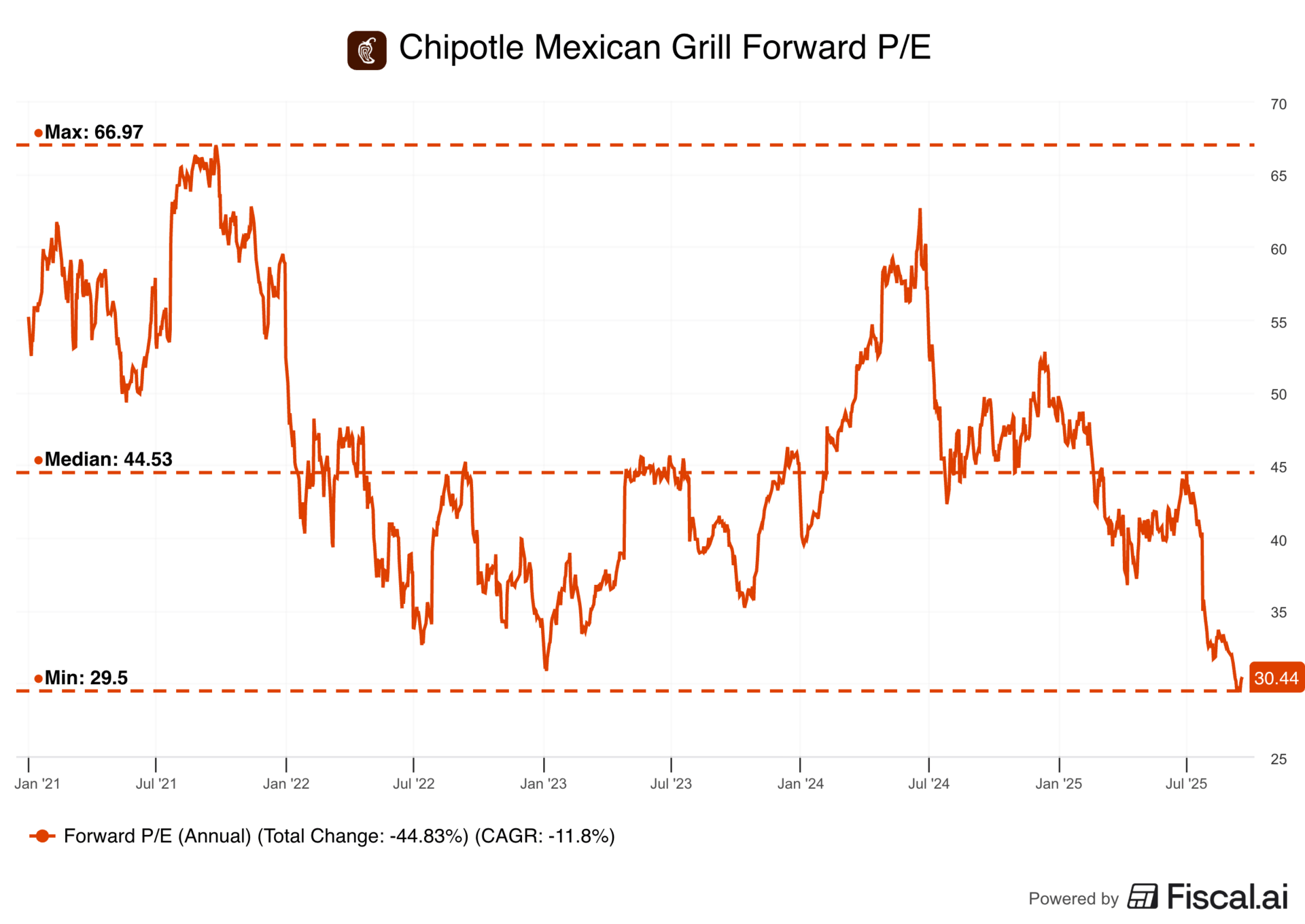 4/ Rich Valuation — For much of the last five years, Chipotle traded at around a median 45x forward earnings, reflecting its brand power and unit economics. That multiple has compressed to a five-year low of ~30x, which is still an expensive valuation.