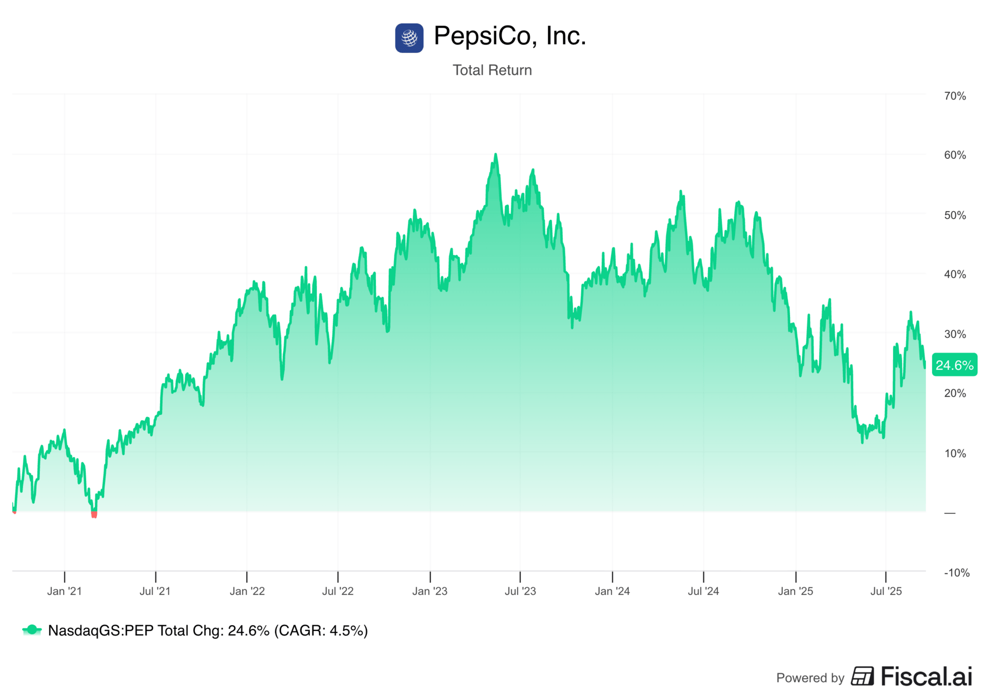 Over the last five years, PepsiCo has delivered a total return of just 25%, significantly trailing Coca-Cola’s 53% and underperforming the broader market.