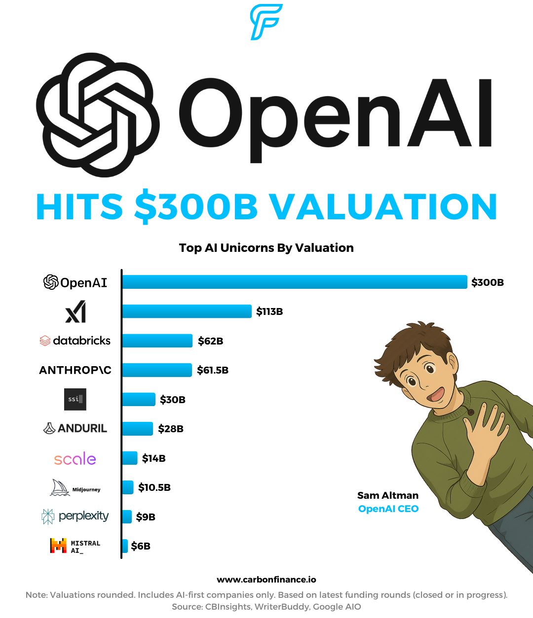 That puts OpenAI at a $300B valuation, making it the third most valuable unicorn behind SpaceX and ByteDance.