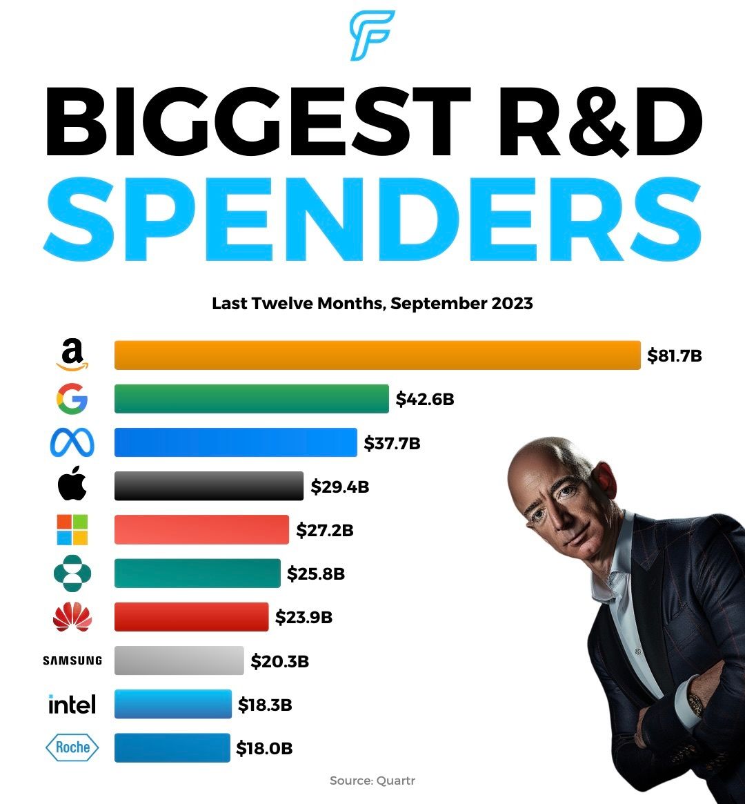 Over the last twelve months, Amazon led in R&D spending, investing over $81B. The top 5 is comprised of big tech which has been heavily investing into AI.