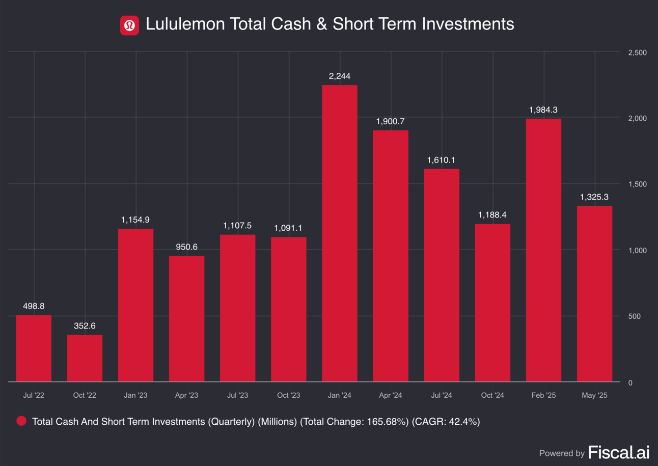 This seasonal dip is typical for Lululemon, as Q1 often reflects inventory builds and CapEx spends ahead of stronger cash flow generation in Q4.
