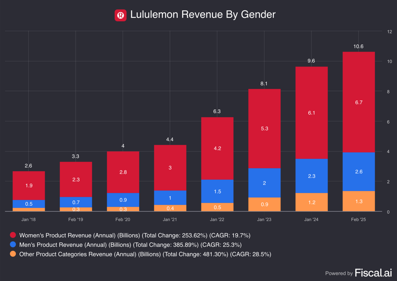 Women’s products account for 63% of revenue, while men’s products make up 25%.