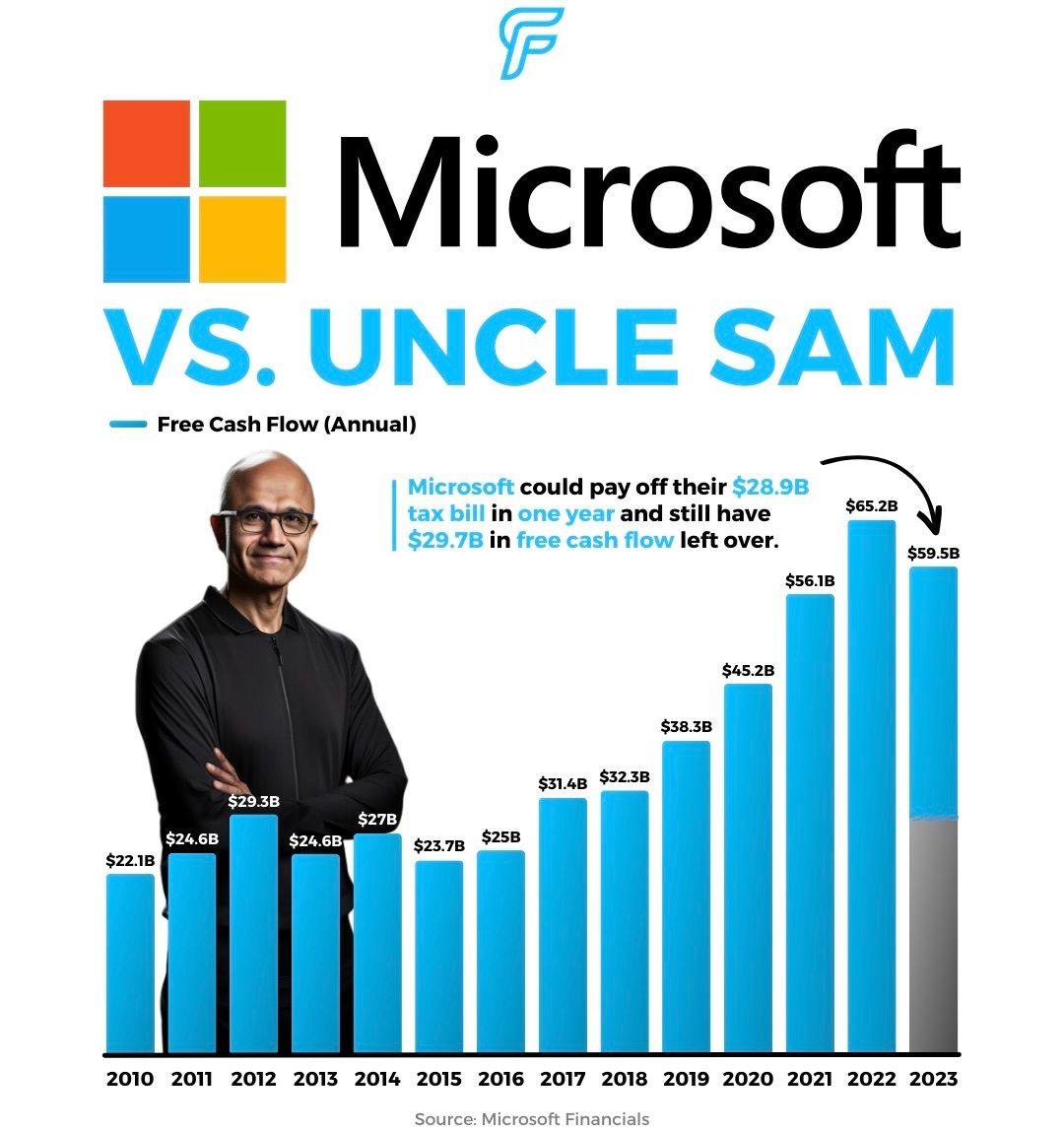 In fiscal year 2023, Microsoft generated $59.5B in free cash flow. Furthermore, Microsoft’s 5 year average free cash flow is roughly $53B. This means that Microsoft could pay off their tax bill in a single year using the free cash flow they typically generate, and still have tons of cash left over. This also doesn’t include the $111.3B Microsoft has in total cash, cash equivalents, and short-term investments.