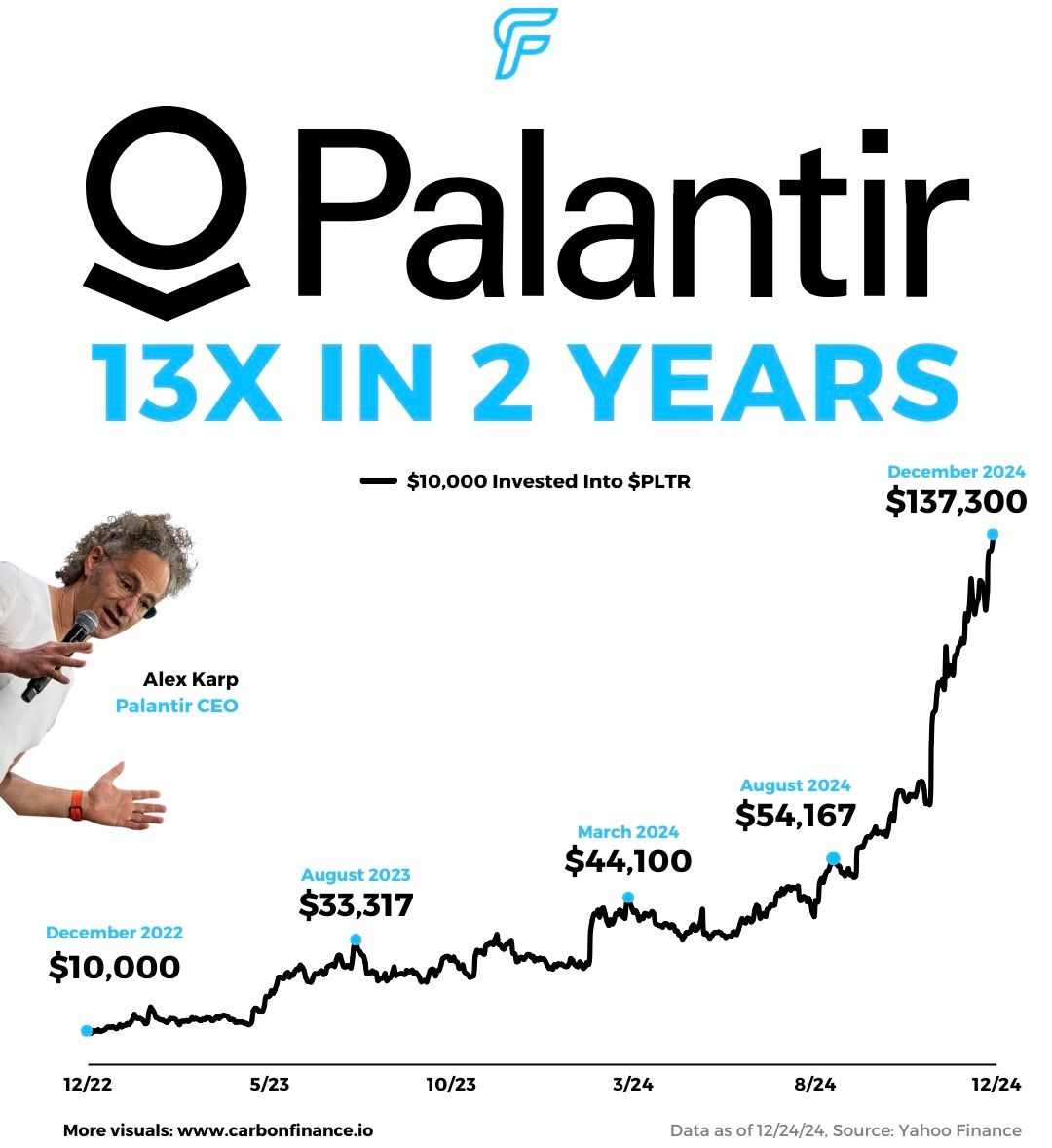 Even more astonishing, Palantir has climbed 1,200% over the past two years—a more than 13x jump.