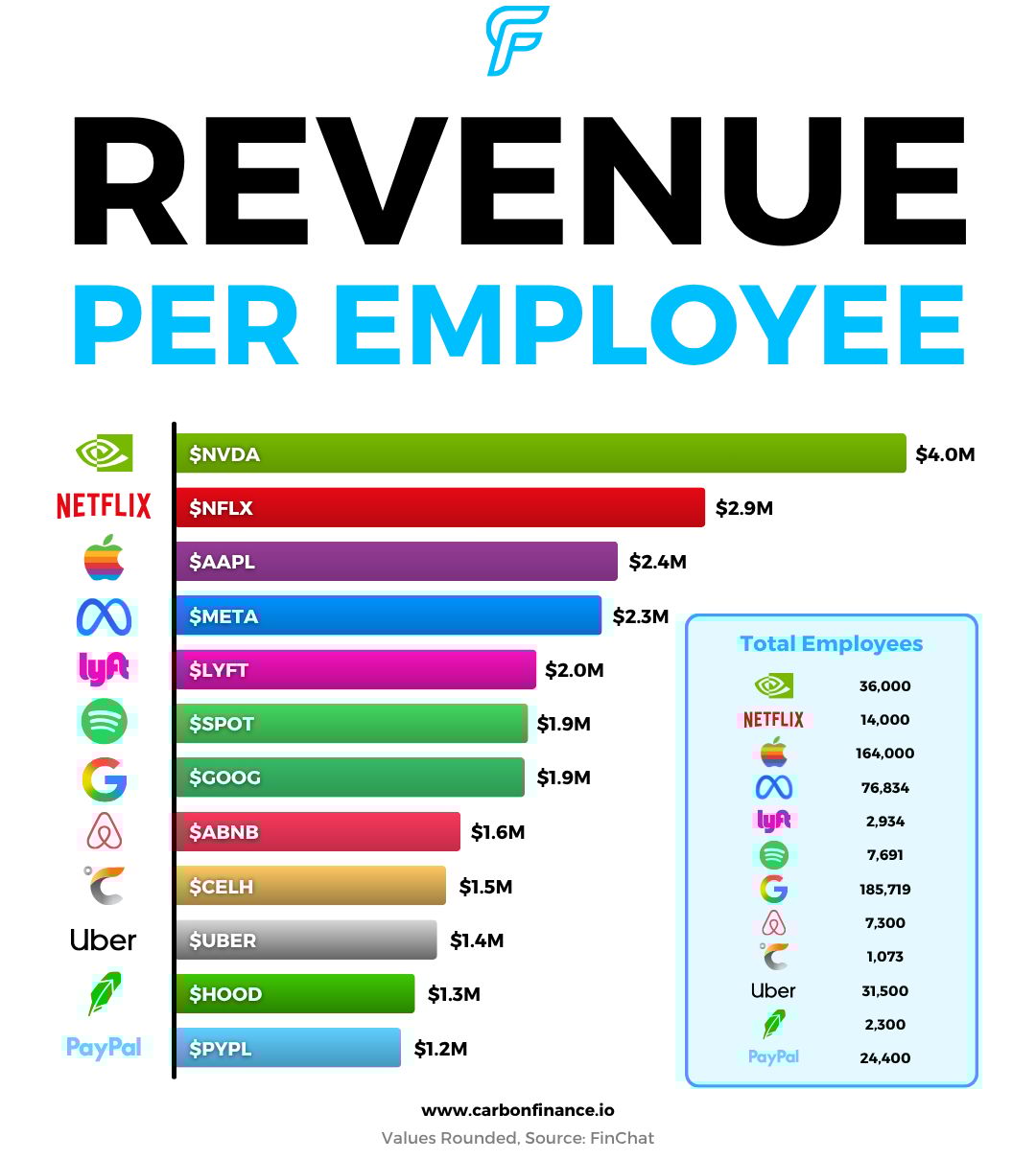 Apple and Meta also have strong numbers, each generating close to $2.5M per employee.