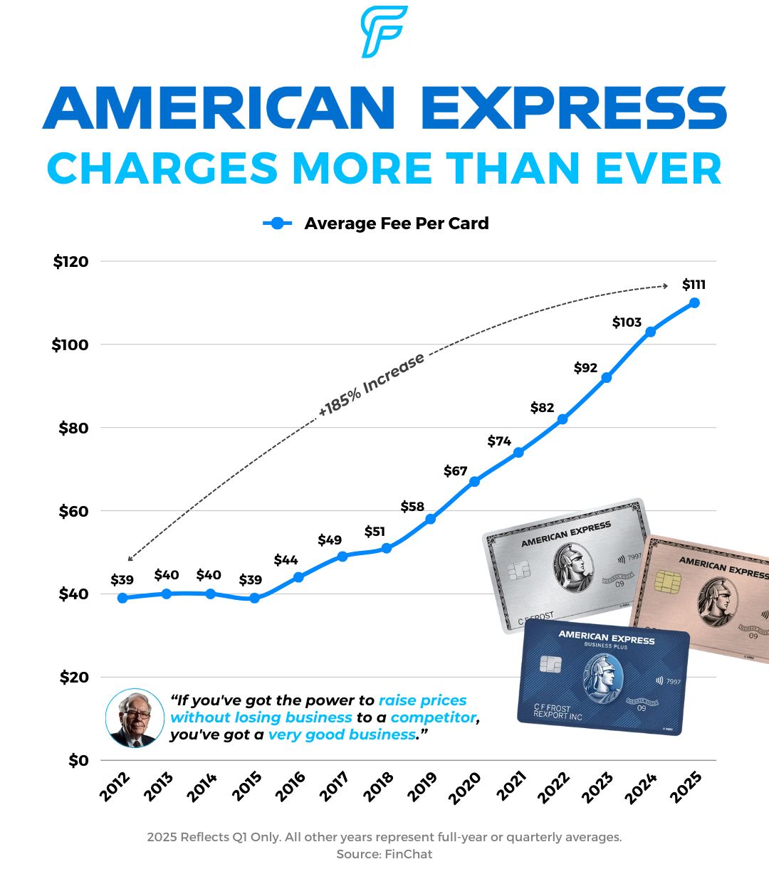 AmEx has also steadily raised the average fee per card, now at $111, up 185% since 2012.