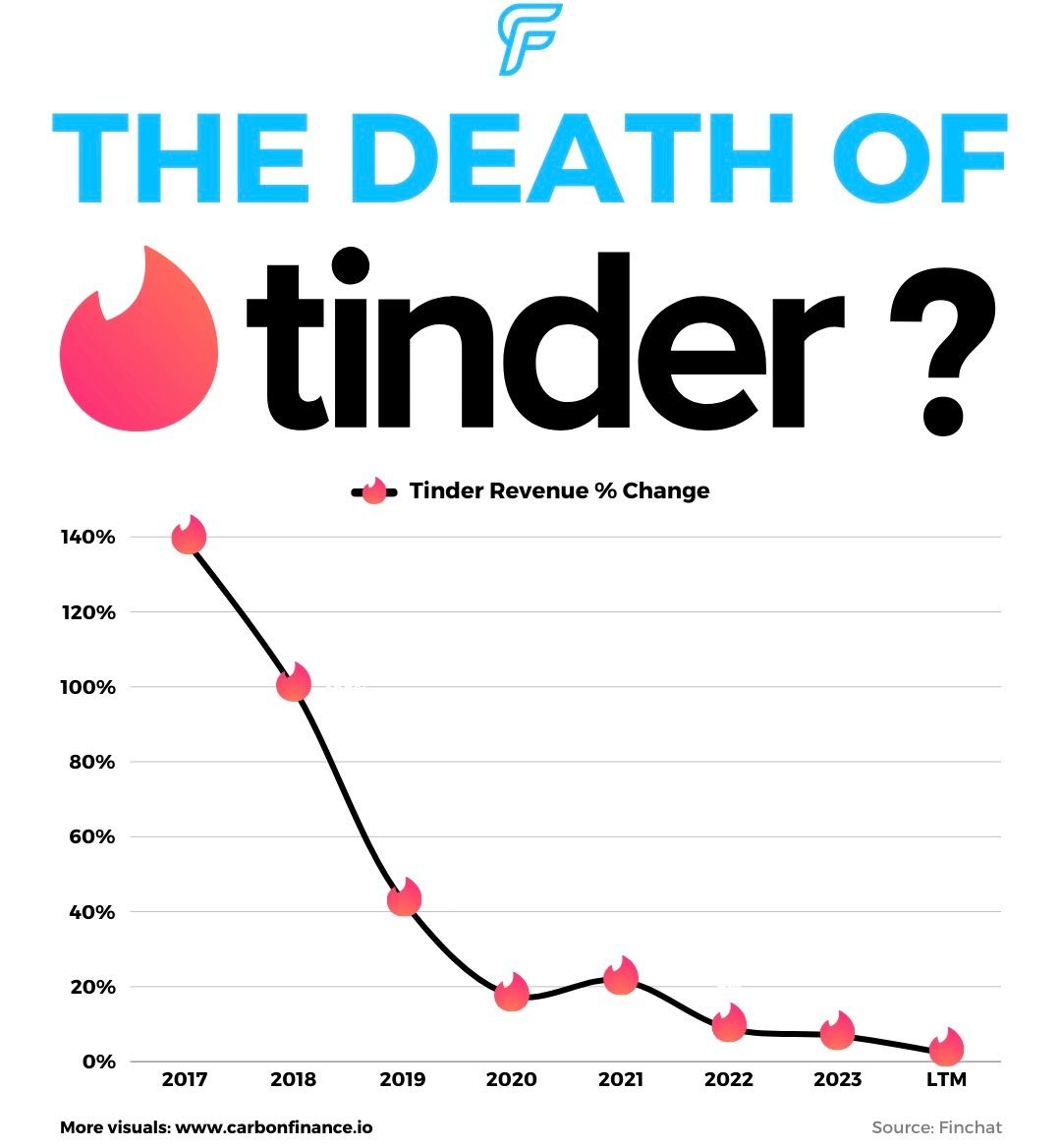 Tinderâs revenue declined 1%, continuing a slowdown that has persisted since 2017.