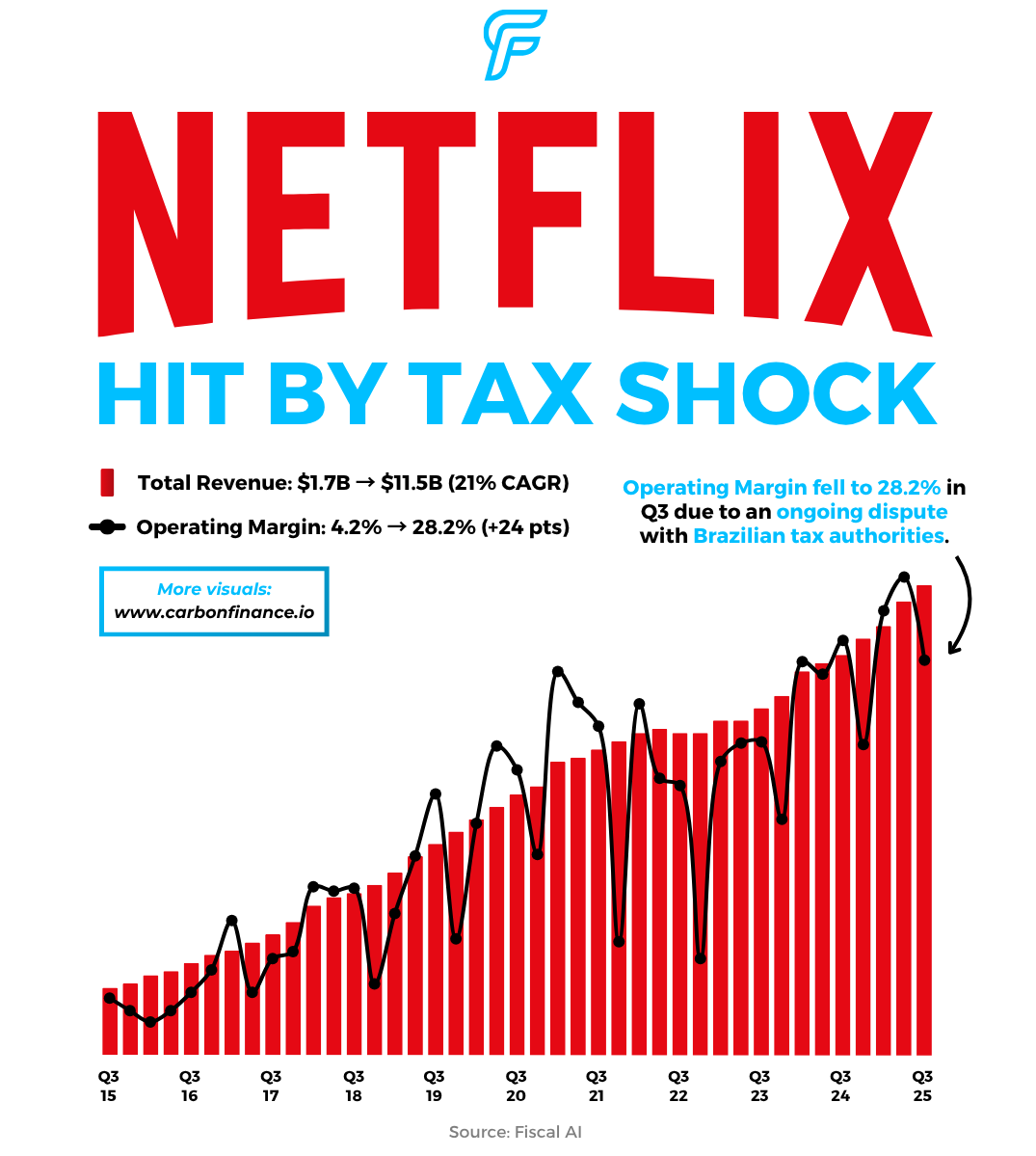 Operating margin came in at 28.2%, below the 31.5% forecast, due to a $619M expense tied to an ongoing dispute with Brazilian tax authorities.
