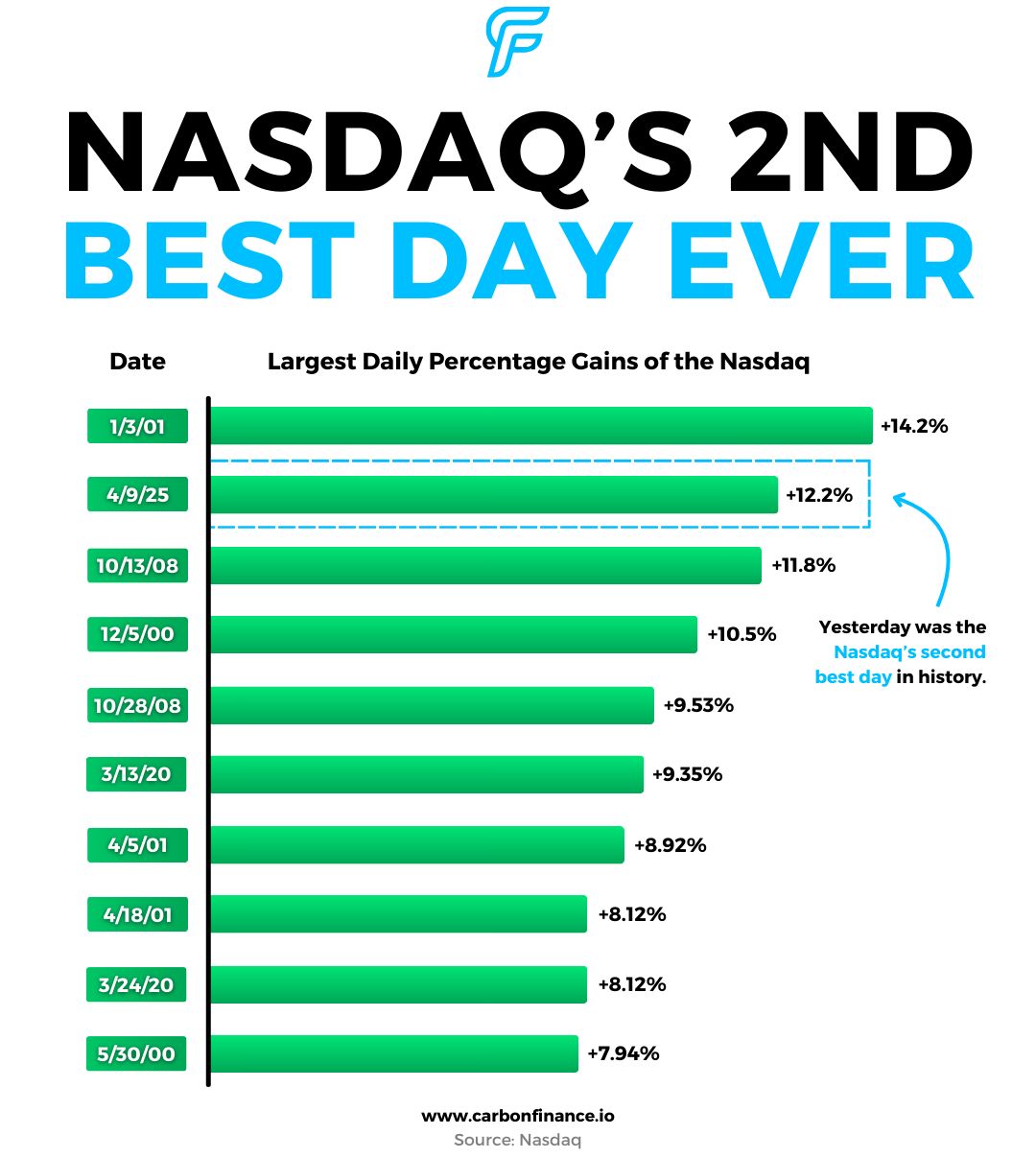 The Nasdaq jumped 12.2%, marking its second-best day in history.