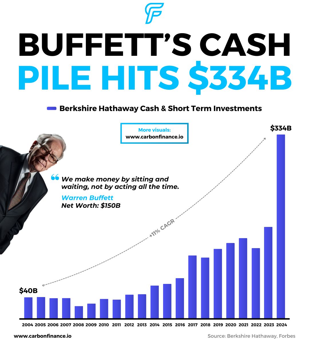 Berkshire Hathawayâs total cash and short-term investments hit $334B at the end of 2024, roughly doubling from 2023 (+99%).