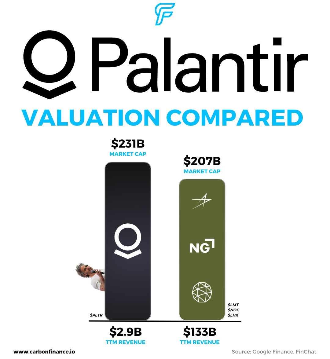 Even after the dip, Palantirâs $231B market cap now surpasses defense giants Lockheed Martin, Northrop Grumman, and L3Harris Technologiesâdespite generating 46x less revenue than the three combined.