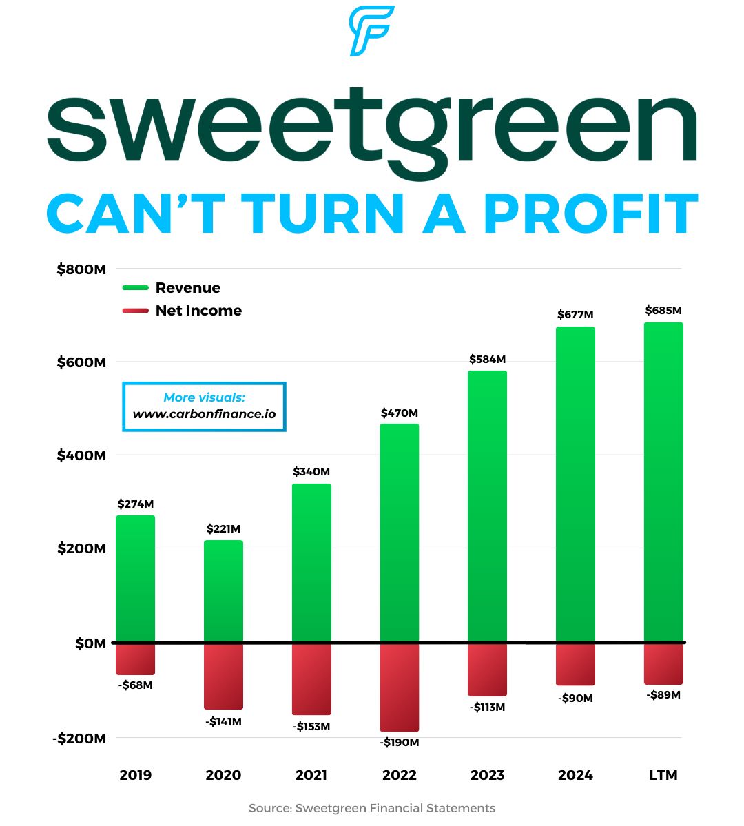 Sweetgreen has never turned a profit since going public and posted a net loss of $89M in the most recent twelve-month period.